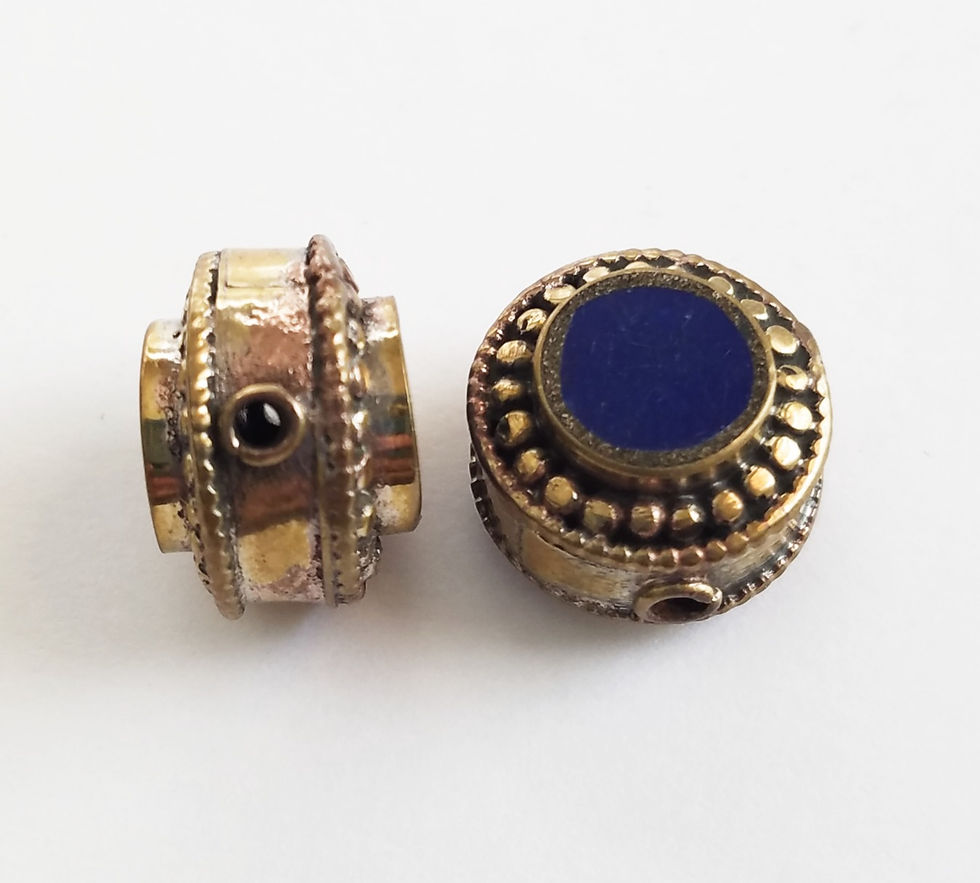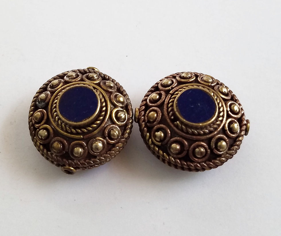 Brass Tibetan Bead with Turquoise and Coral Inlay. Set of 2